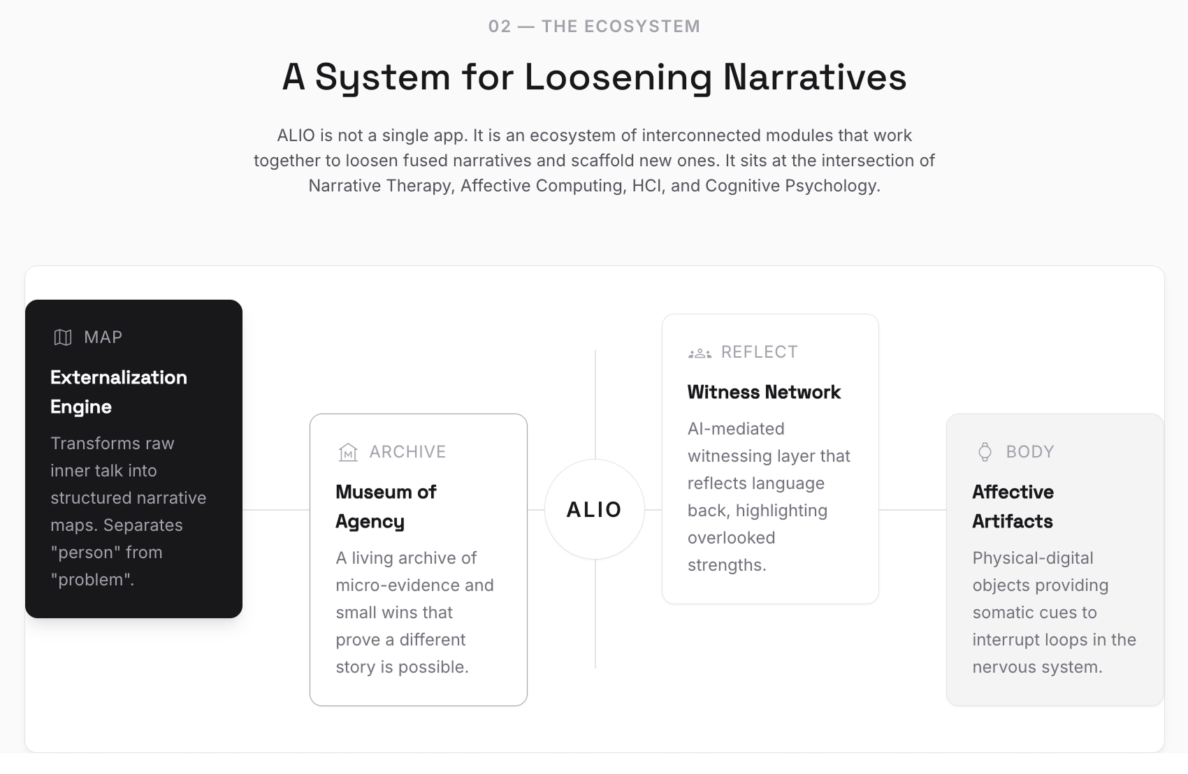 ALIO operates as an ecosystem of four distinct but interconnected modules. Each module targets a specific phase of the narrative reconstruction process, from initial externalization to embodied integration. By distributing the therapeutic process across digital sense-making and physical grounding, the system creates a continuous support loop.
